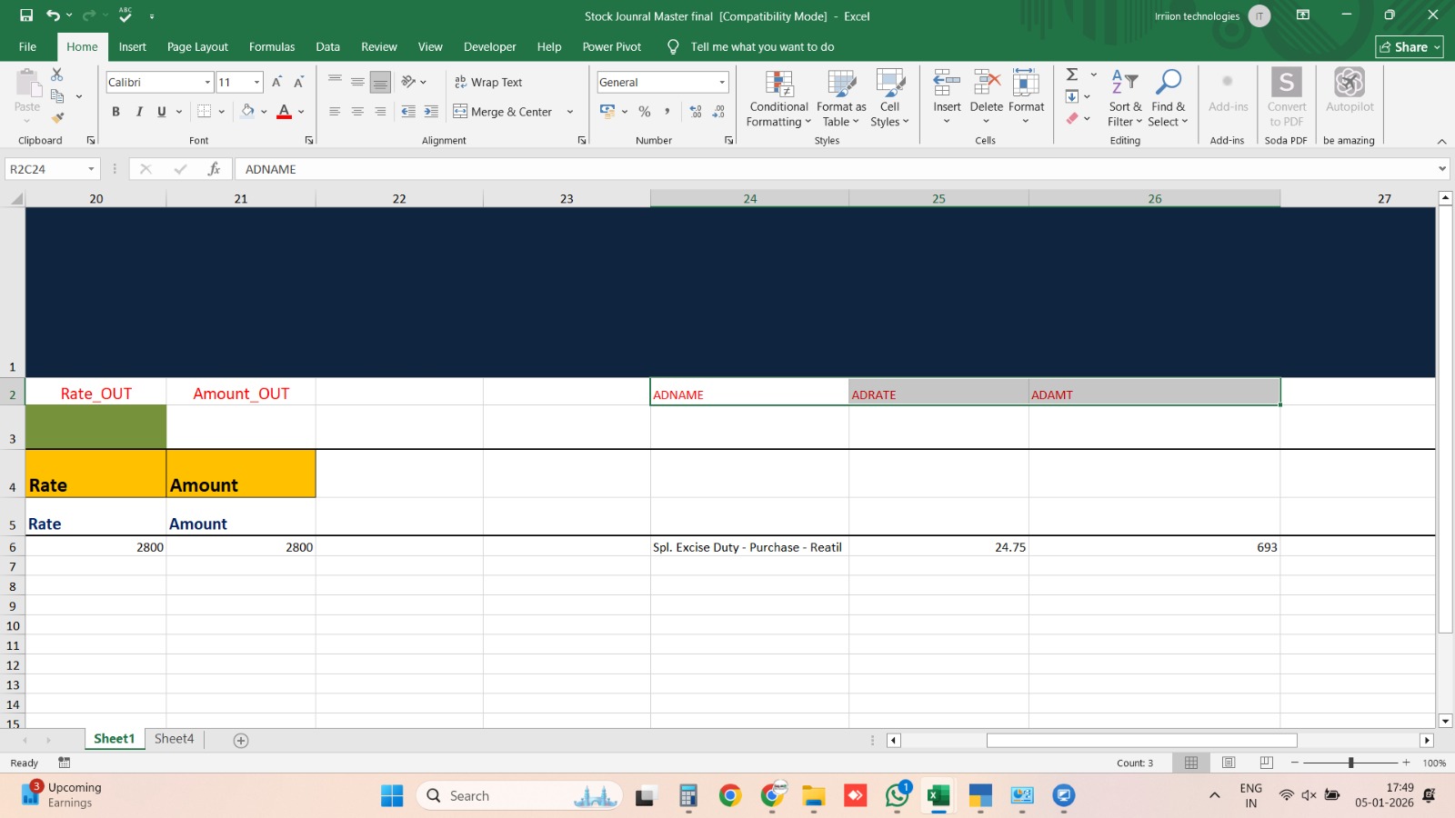 This requirement cannot be handled in Tally’s normal Stock Journal, so a custom Stock Journal solution was prepared,added 3 tags for that ADNAME,ADRATE,ADAMT-COL NO -24,25,26 in 2nd row